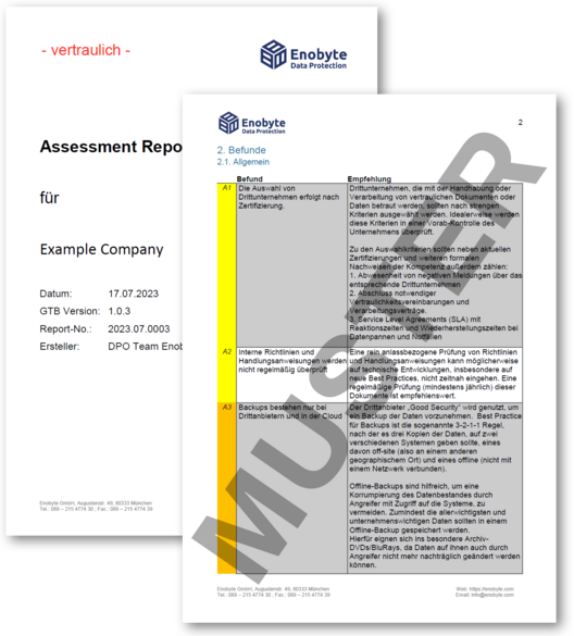 Basierend auf Ihren Antworten erstellen unsere zertifizierten Datenschutzexperten einen auf Ihr Unternehmen zugeschnittenen Bericht mit Befunden und ausführlichen Empfehlungen zur Behebung der erkannten Risiken. Eine einleitende Zusammenfassung (executive summary) dient als Überblick. Die dem Risiko entsprechende Farbkodierung ermöglicht Ihnen eine schnelle Priorisierung der Maßnahmen.
