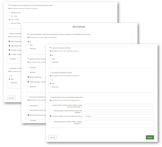 Etwa 200 Fragen beleuchten alle Facetten Ihres Unternehmens von den Grundlagen der Datenverarbeitung über spezielle Verarbeitungsszenarien bis hin zur detaillierten Abfrage der bestehenden IT-Sicherheitsmaßnahmen.