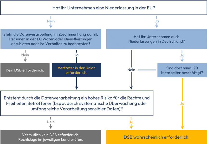 Für viele Unternehmen, die Daten aus der EU oder dem EWR verarbeiten, ist die Benennung eines DSB gesetzlich vorgeschrieben. Die genauen Bestimmungen unterscheiden sich innerhalb der EU von Land zu Land. Das untenstehende Flowchart soll Ihnen eine erste Orientierung bieten.